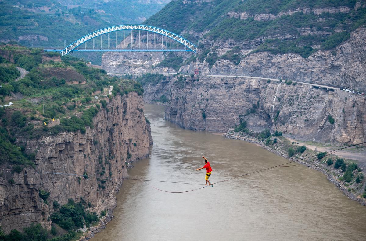 Chinese slackline athlete Shi Linhai set a new Asian record for walking on a slackline high above the Yellow River in North China's Shanxi province on June 2, 2024. [Photo by Xue Jun for chinadaily.com.cn]