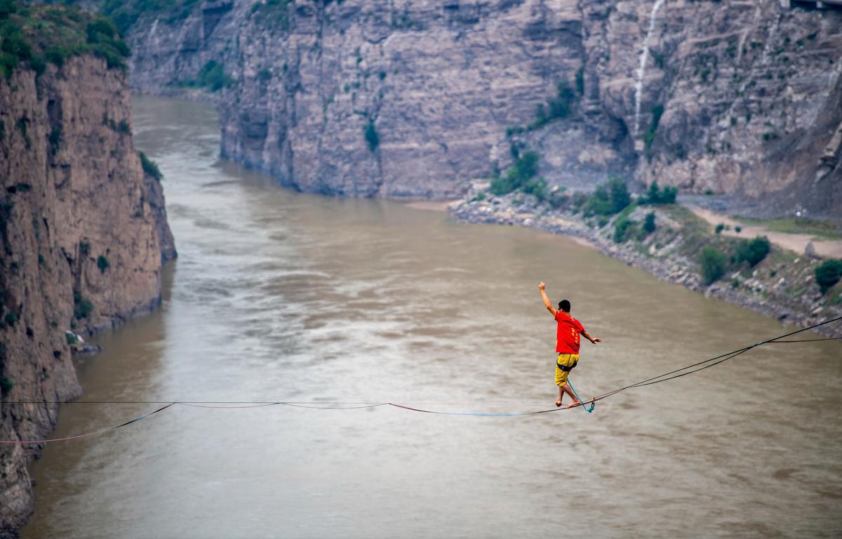 Chinese slackline athlete Shi Linhai set a new Asian record for walking on a slackline high above the Yellow River in North China's Shanxi province on June 2, 2024. [Photo by Xue Jun for chinadaily.com.cn]