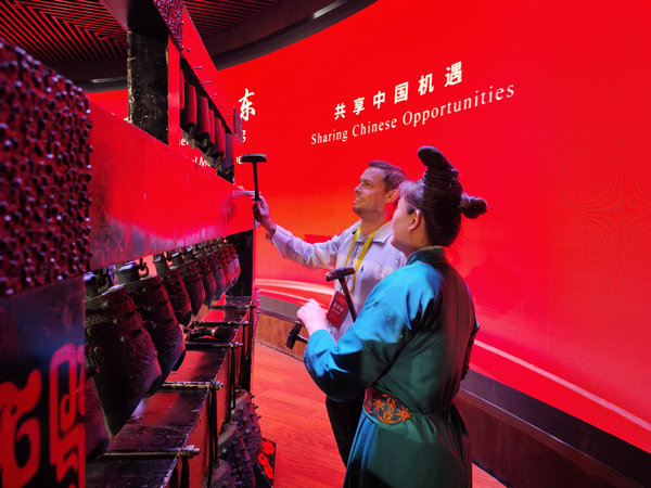 Nick Ive, a British editor with China Daily, learns to play zhong (bells) at the Confucius Museum in Qufu of Jining city, East China's Shandong province on June 2, 2024. [Photo provided to chinadaily.com.cn]