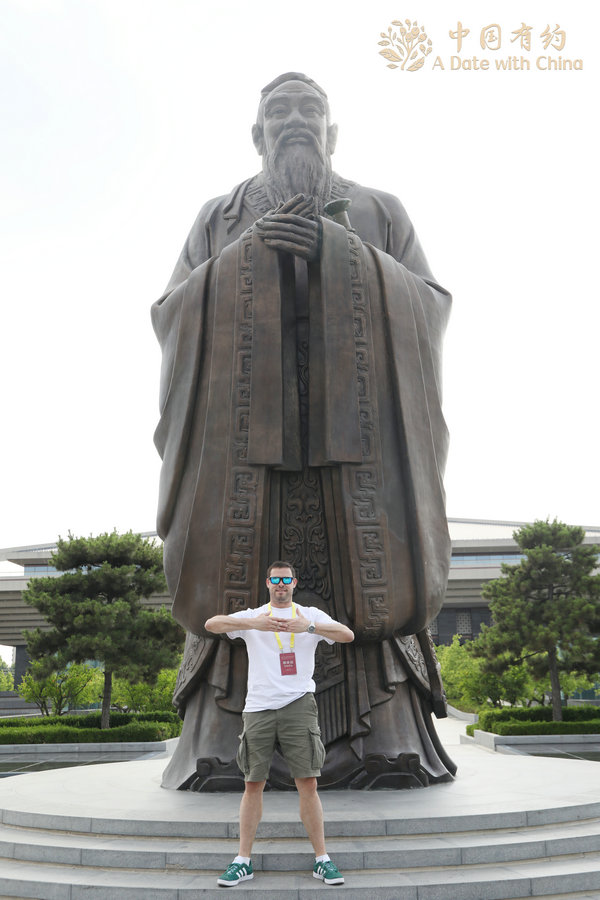Nick Ive poses for a photo in front of a Confucius statue at the Confucius Museum in Qufu of Jining city, East China's Shandong province on June 3, 2024. [Photo provided to chinadaily.com.cn]