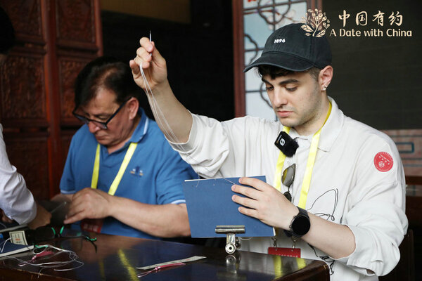 Members of the "A Date with China 2024 – Meet Shandong" international media tour, learn to make thread-bound books in Qufu, East China's Shandong province, on June 3, 2024. [Photo provided to chinadaily.com.cn]