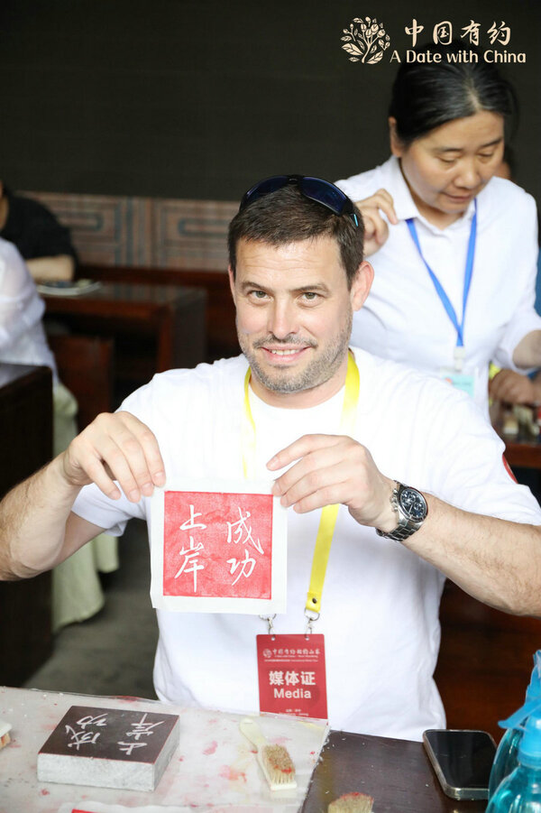 Nick Ive, a British editor with China Daily, poses for a photo with a stone rubbing he made in Qufu, East China's Shandong province, on June 3, 2024. [Photo provided to chinadaily.com.cn]