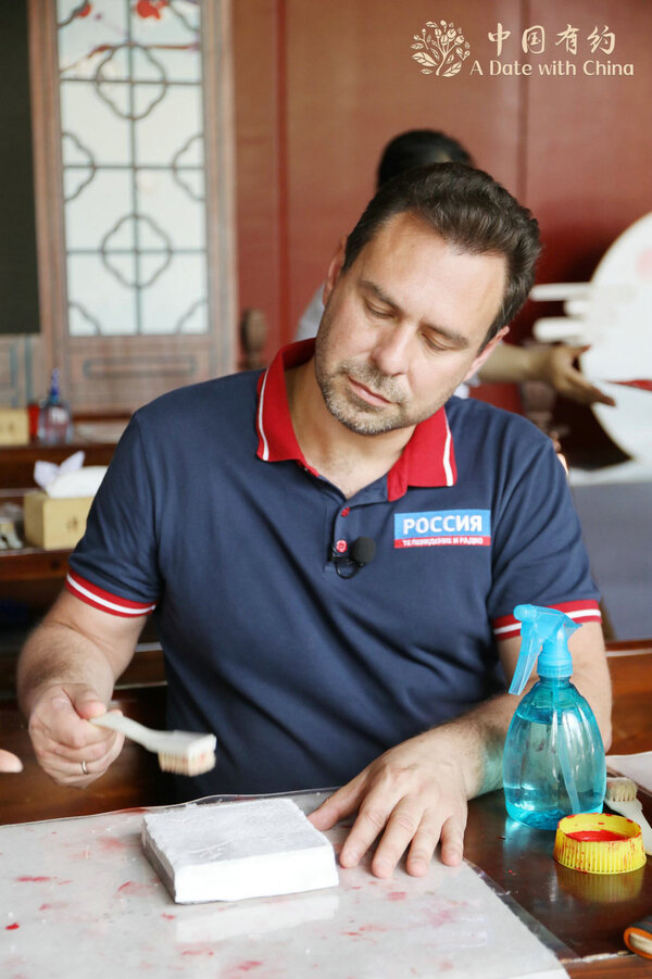 Alexander Balitskiy (right), a Russian reporter based in China, tries his hand at stone rubbing in Qufu, East China's Shandong province, on June 3, 2024. [Photo provided to chinadaily.com.cn]