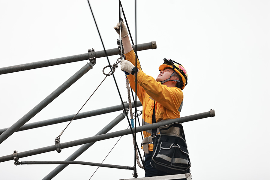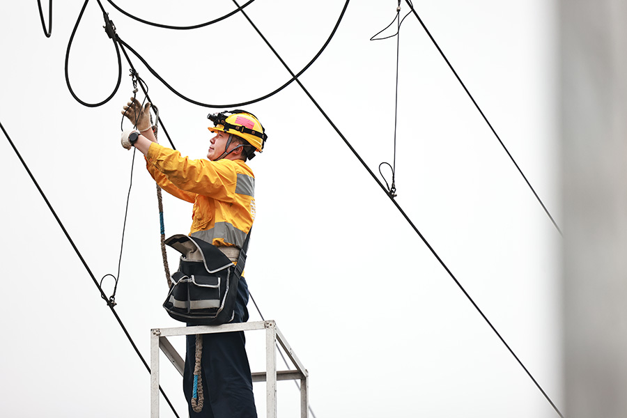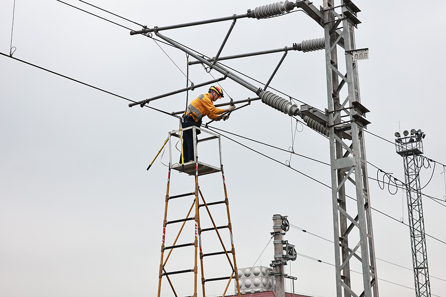A worker checks the overhead lines in Southwest China's Chongqing municipality, June 4, 2024. [Photo by Ran Jie and Su Zhigang/For chinadaily.com.cn]