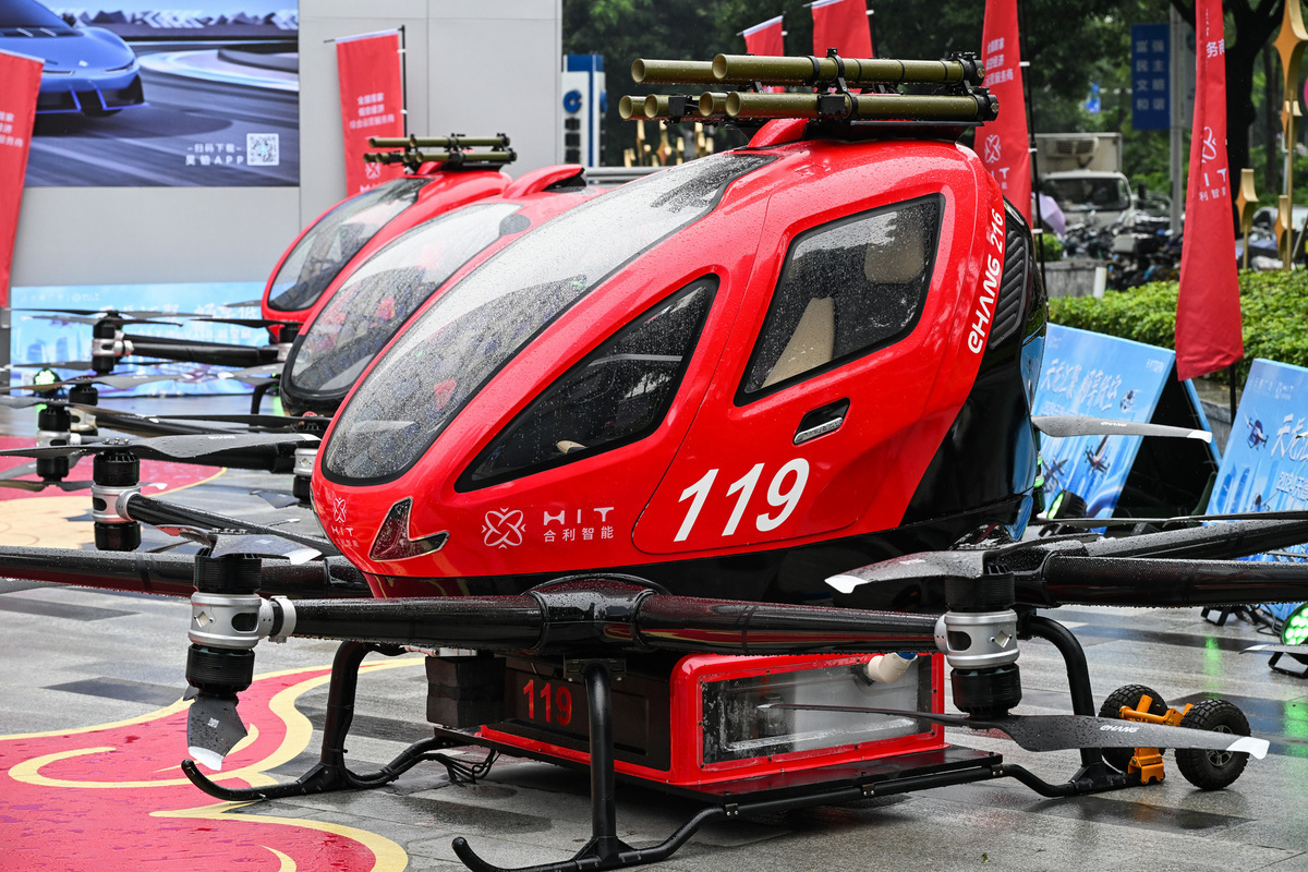 Fire fighting eVTOL vehicles are displayed during a low-altitude air show in Guangzhou, Guangdong province, on June 3, 2024. [Photo/Xinhua]