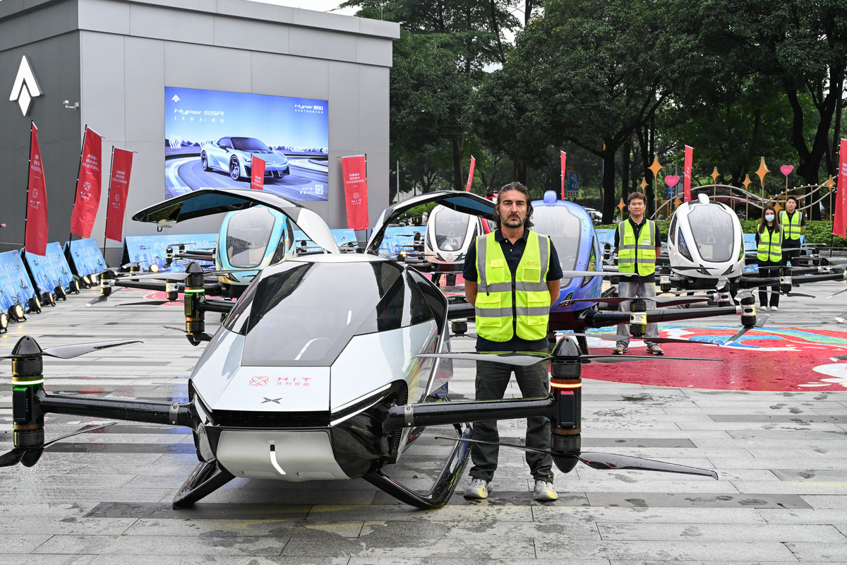 Ehang's EH216 eVTOL vehicles are displayed during a low-altitude air show in Guangzhou, Guangdong province, on June 3, 2024. [Photo/Xinhua]