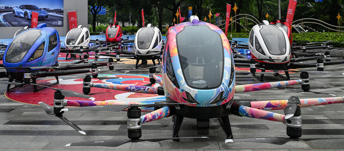 EVTOL vehicles are displayed during a low-altitude air show in Guangzhou, Guangdong province, on June 3, 2024. [Photo/Xinhua]
