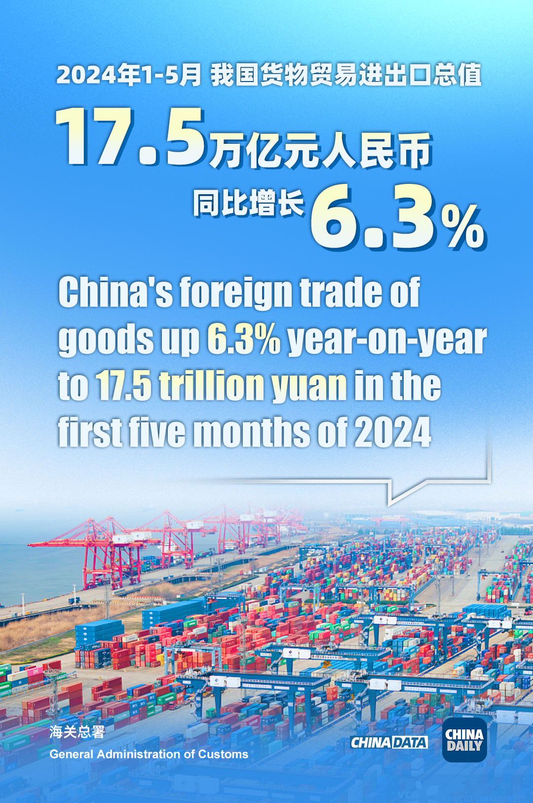 From January to May, the country's foreign trade in goods stood at 17.5 trillion yuan (about $2.46 trillion). Exports reached 9.95 trillion yuan, while imports hit 7.55 trillion yuan.