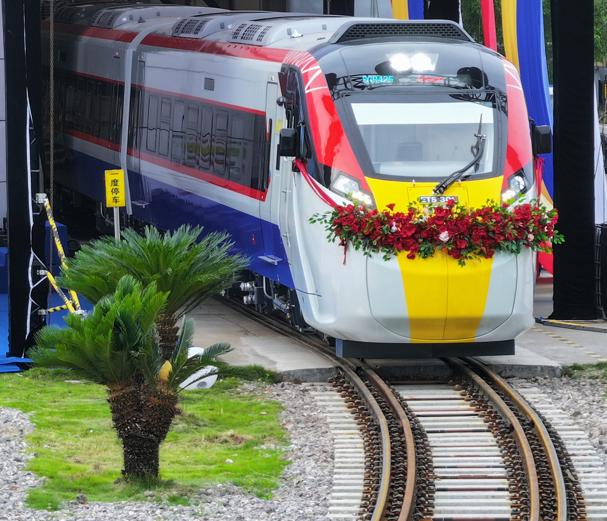 A drone photo taken on June 7, 2024 shows a new ETS3 train for Malaysia at CRRC Zhuzhou Locomotive Co Ltd in Zhuzhou, Central China's Hunan province. [Photo/Xinhua]