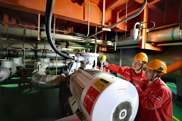 Staff members of the Chengdao No 1 central platform of Shengli offshore oil field conduct a night inspection for the hub, in Dongying, Shandong province, June 4, 2024. [Photo by Wang Jing/chinadaily.com.cn]