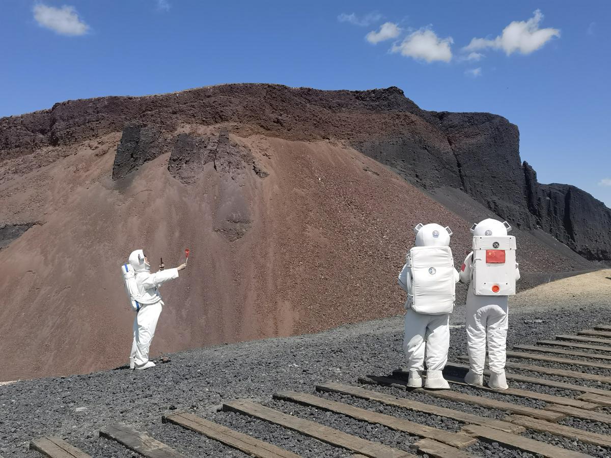 Visitors take pictures in the Ulan Hada Volcanic Geological Park, known as a natural "volcanic museum". [Photo provided to chinadaily.com.cn]