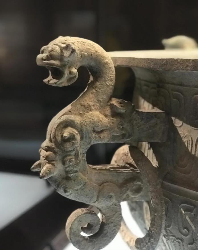 Detail of the kui dragon-shaped handle of the bronze container [Photo/Official WeChat account of the Luoyang Museum]