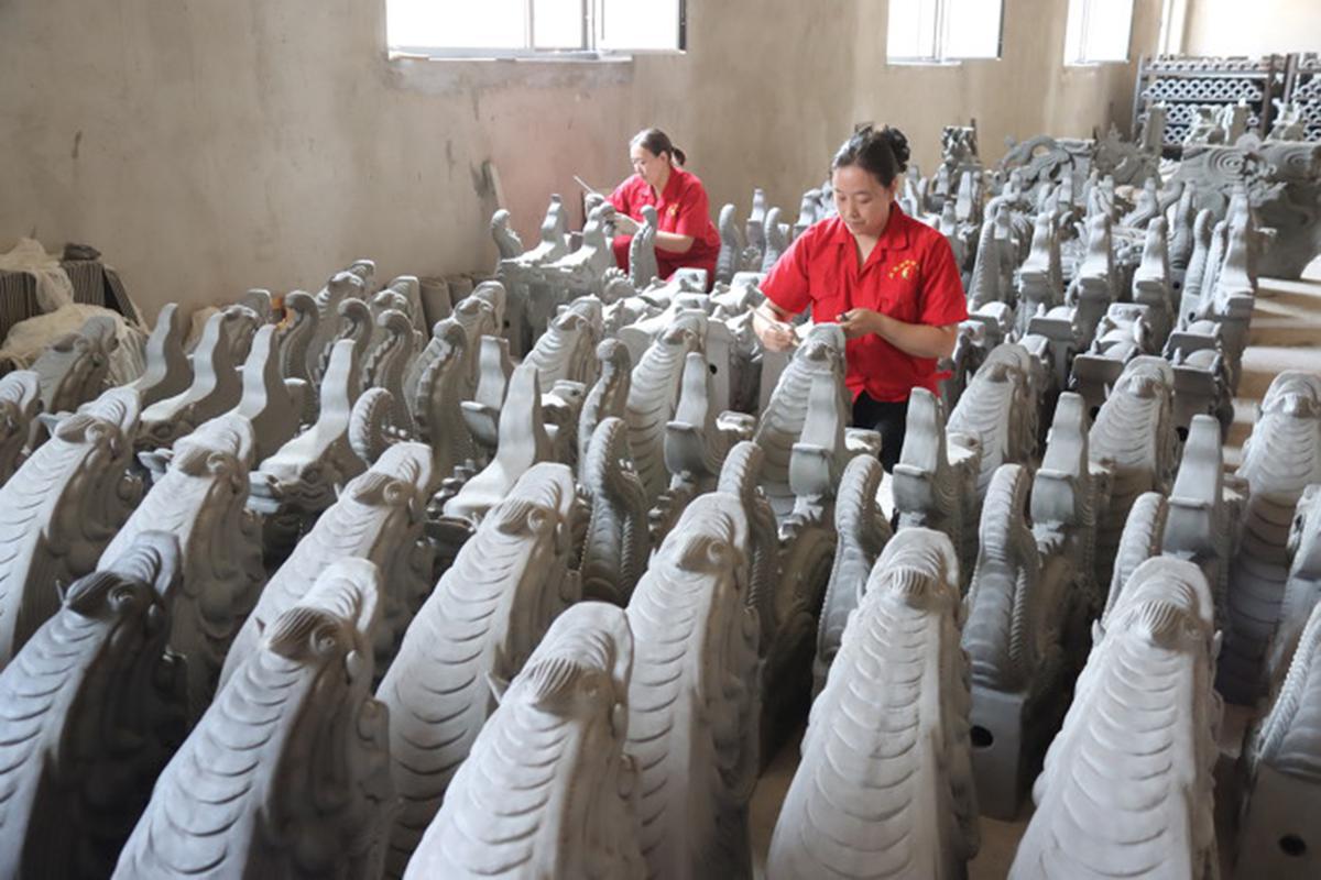 Artisans are busy making colored glaze products at the national intangible cultural heritage production base in Houzeyao village of Jincheng city, Shanxi province. [Photo by Chen Laiquan/For chinadaily.com.cn]