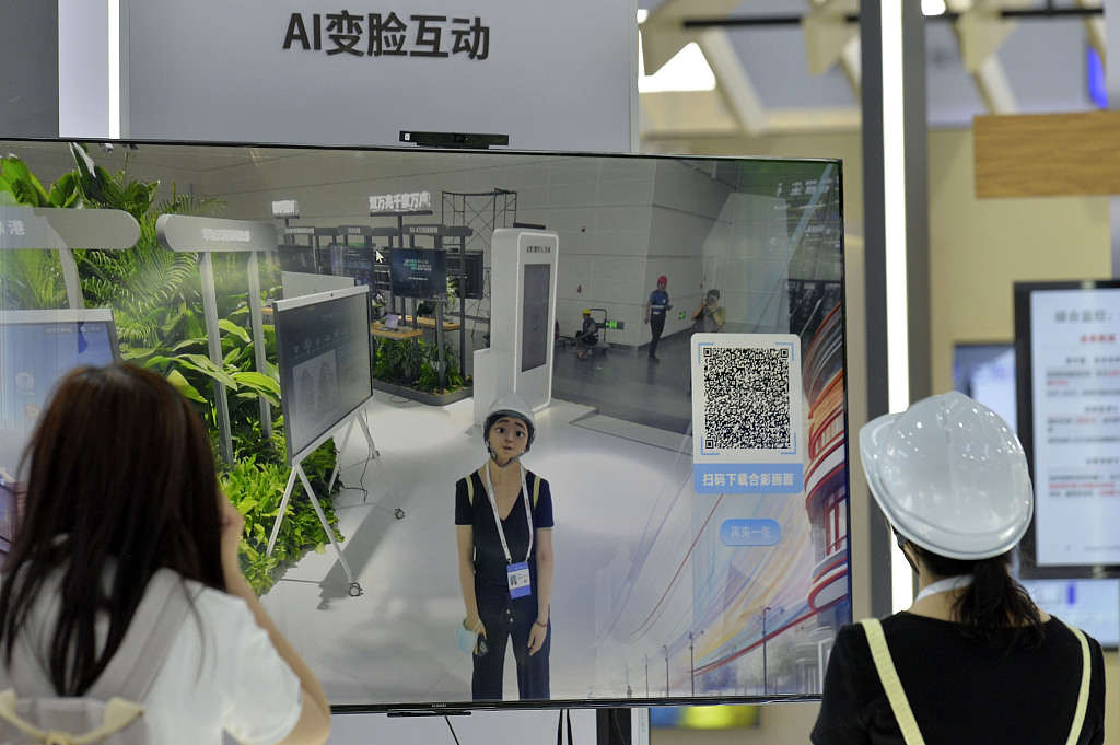 Visitors interact with an AI figure at Huawei's booth at the 2024 World Intelligence Expo at the National Convention and Exhibition Center in North China's Tianjin, June 18, 2024. [Photo/VCG]