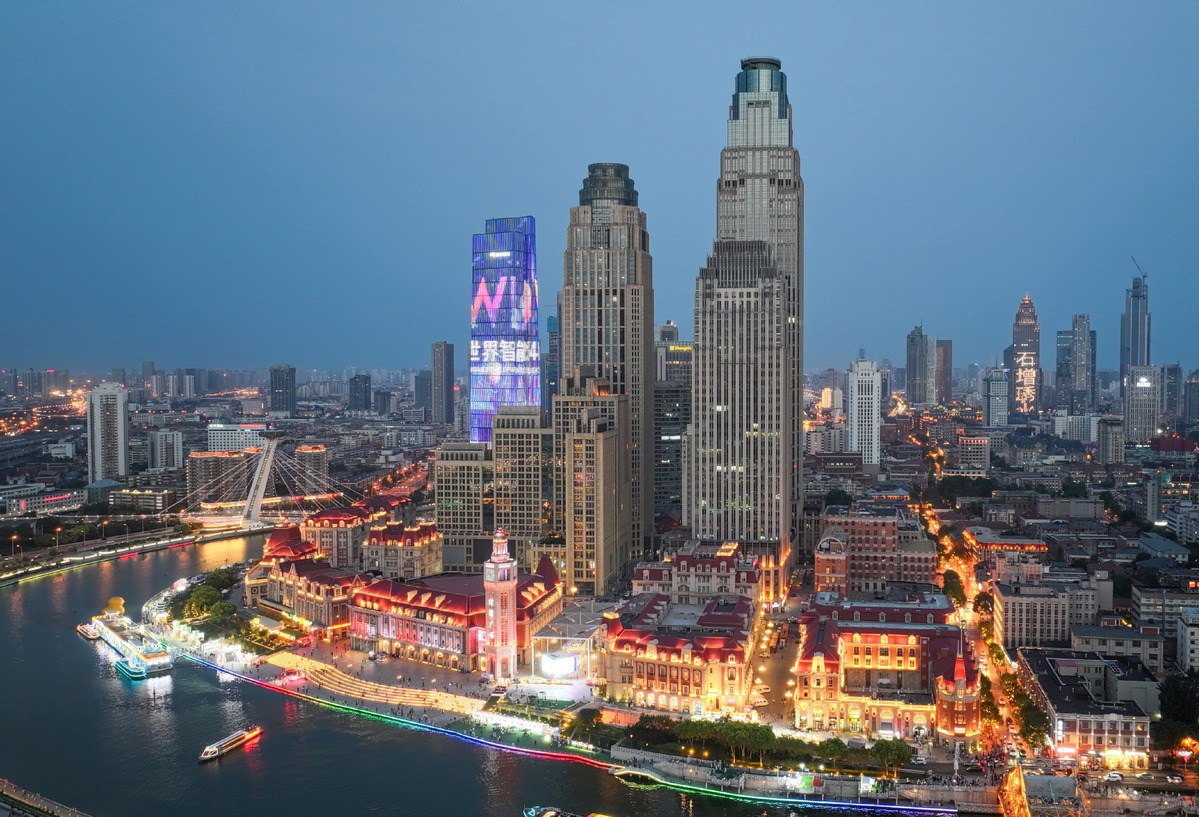 Tianjin lights up a slogan for the 2024 World Intelligence Expo on skyscrapers along the Haihe River in North China's Tianjin, June 18, 2024. [Photo/Xinhua]
