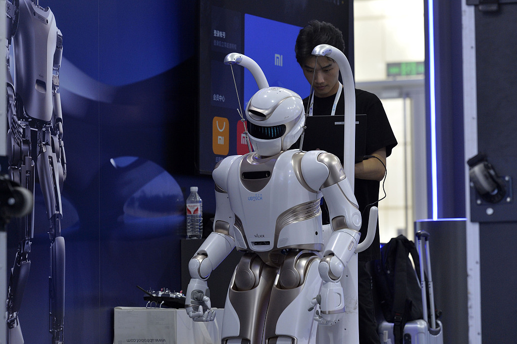 A staff member prepares a humanoid robot at the 2024 World Intelligence Expo at the National Convention and Exhibition Center in North China's Tianjin, June 18, 2024. [Photo/VCG]