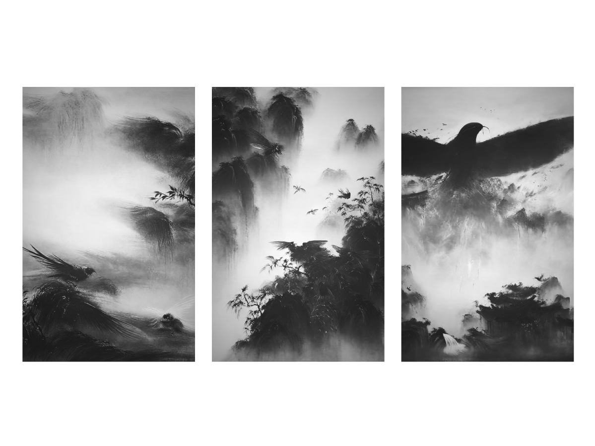 This group of illustrations is inspired by the poem A Happy Excursion written by Chinese philosopher Zhuang Zi (369 -286 BC). Using the imagery of the Kun transforming into the Peng from "Xiaoyaoyou" as the main creative subject, the illustrations, along with the mist-shrouded mountains and oceans, create a fantastical and mysterious atmosphere. By incorporating the cicada and the little dove for contrast, it evokes a deeper contemplation of the vastness and mystery of the natural world.