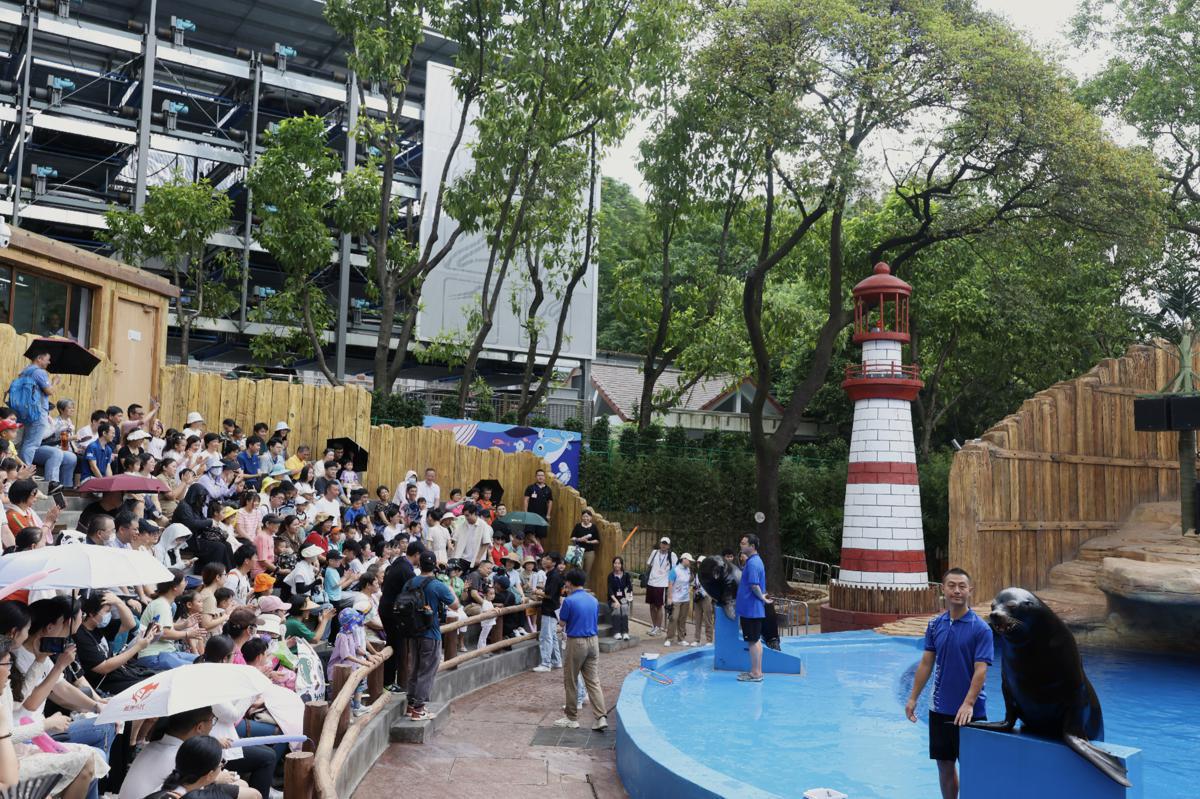 Some audience members outmatch the splash zone with umbrellas during a show at the Ocean World aquarium in Guangzhou, Guangdong province. [Photo by Parker Zheng/China Daily]