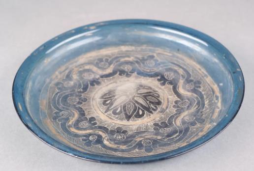 Blue glass plate with eight-petal flower motifs, Tang Dynasty, from the collection of the Famen Temple Museum [Photo/Official WeChat account of the China National Silk Museum]