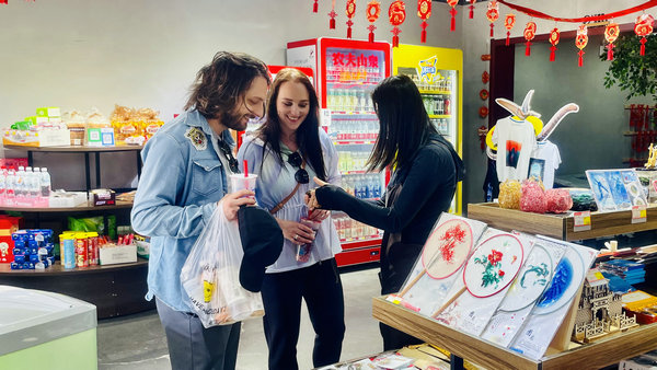 International travelers at a gift shop in the Badaling Great Wall scenic area. [Photo provided to China Daily]