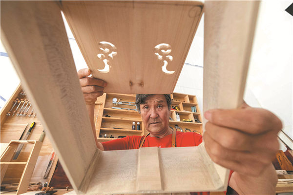 Ulji, 65, works on the making of the instrument's trapezoid-shaped body. The crafting of the instrument is still done by hand. [Photo by Ding Genhou/For China Daily]