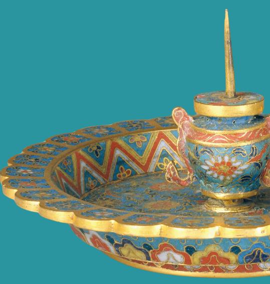 Detail of a cloisonné enamel chrysanthemum petal-shaped candlestick with interlocking chrysanthemum motifs, Ming Dynasty (1368-1644) [Photo/Official WeChat account of the Palace Museum]