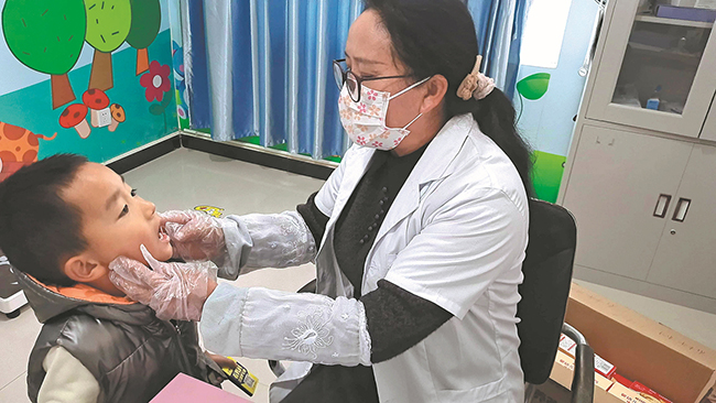 Zhang Zhijuan checks a child's teeth at a clinic in Gaofa village in Dali Bai autonomous prefecture, Yunnan province. [Photo provided to China Daily]