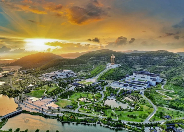 A panoramic photo captures Nishan Sacred Land, showcasing the towering statue of Confucius on Nishan Mountain. [Photo by Feng Lei/WeChat account: jnrbwx]