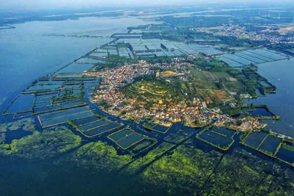 An aerial view of Dushan Island, with its clear waters and lush mountains. [Photo by Yang Guoqing/WeChat account: jnrbwx]