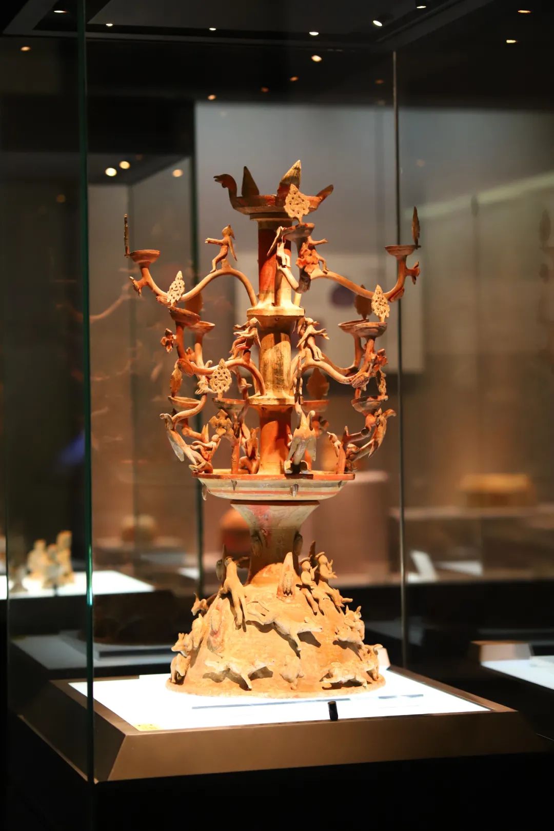 This painted pottery lamp from the Eastern Han Dynasty (25-220) consists of a lamp pole, a lamp base and 12 curved branches, each terminating with a shallow bowl designed to hold oil and a wick. When all 12 wicks are lit, the lamp appears so gorgeous that it resembles a flowering tree.