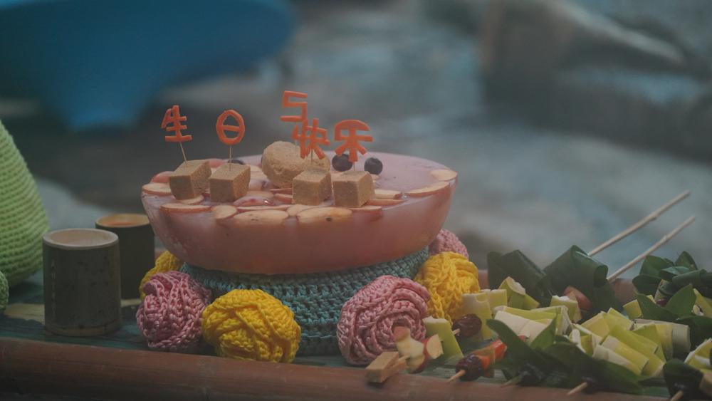 The special birthday food was made of steamed cornbread, freshly squeezed watermelon juice, as well as skewers of bamboo leaves, bamboo shoots, carrots, apples, peaches and red dates.