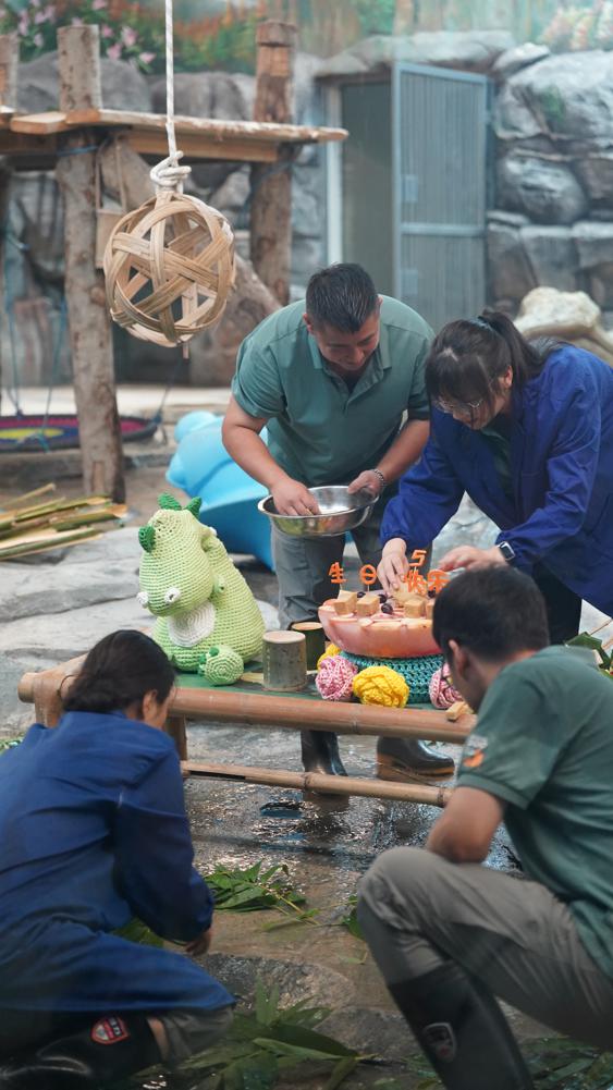 Animal keepers at a zoo in Wuhan, Hubei province, prepared special birthday food for a giant panda as it celebrated its fifth birthday on Friday.