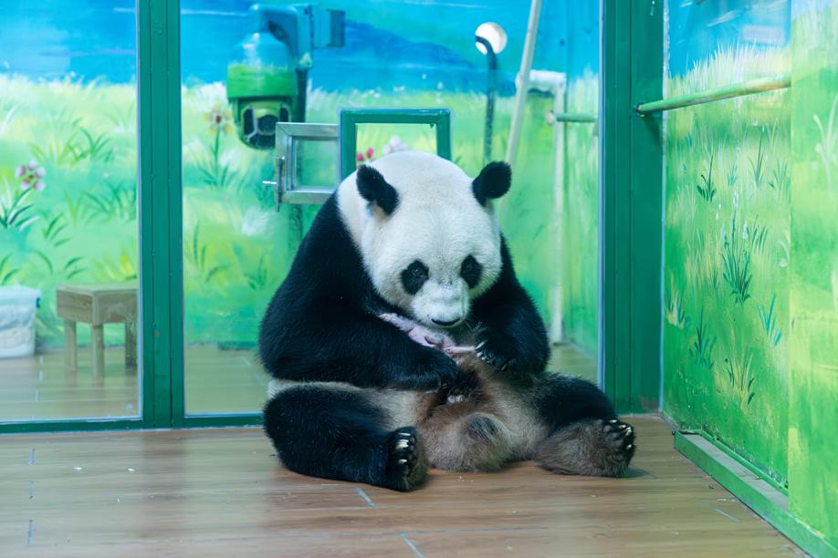 The conservation team conducts daily physical examinations on the cub, meticulously recording its growth data. "The cub's white fur has grown on the pink skin, and the areas around its eyes, ears, shoulders and limbs have started turning black," said Chen.