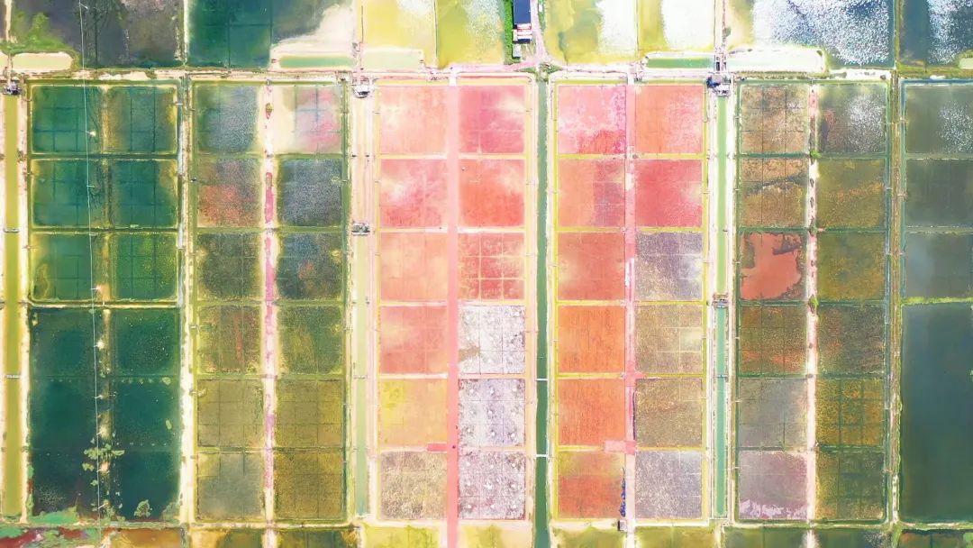 An aerial view of the colorful salt fields in Zhanjiang [Photo/Official WeChat account of Zhanjiang]