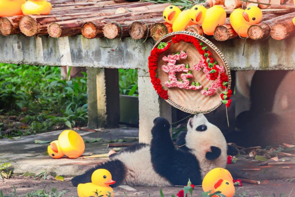 Chongqing Zoo holds a party for panda Mang Cancan for its one-year birthday on July 7, 2024. [Photo provided to chinadaily.com.cn]
