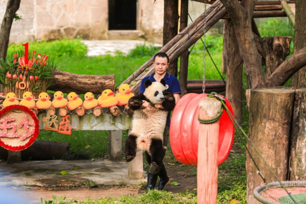 Chongqing Zoo holds a party for panda Mang Cancan for its one-year birthday on Saturday. The keepers prepared a birthday cake made from ingredients such as bamboo shoots, apples, grapes, carrots and tomatoes for Cancan to enjoy. Many local residents and tourists gathered at the Panda House to participate in the event.