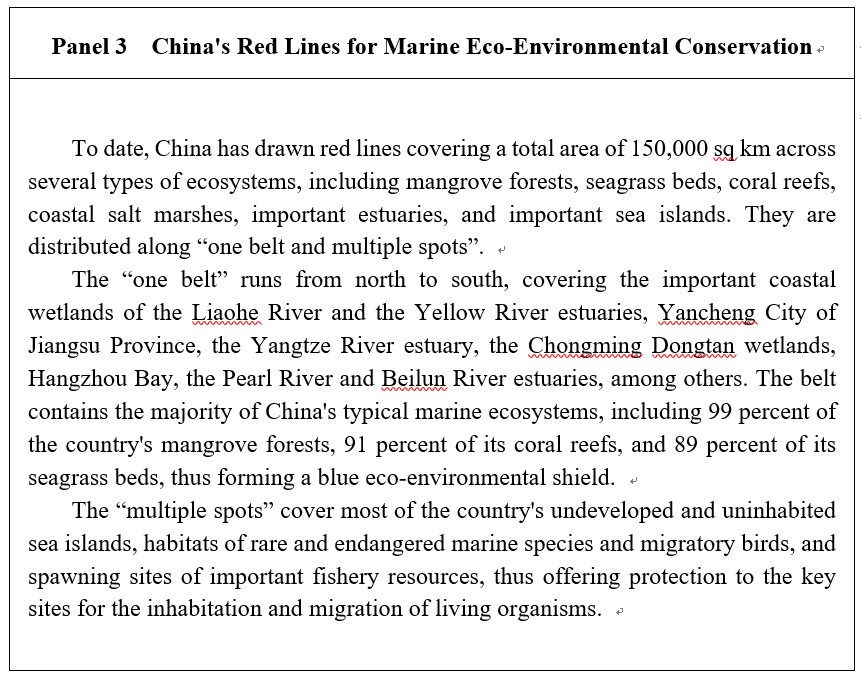 Drawing red lines for marine eco-environmental conservation and strictly enforcing them. Red lines for eco-environmental conservation are an important institutional innovation and a major decision made by China. China has made systematic arrangements for key areas of marine eco-environmental conservation. Areas with extremely important eco-environmental functions, such as biodiversity and coastline protection, together with areas with highly vulnerable ecosystems due to factors such as coastal erosion, have been delimited within the red lines and given strict protection. These areas are distributed along “one belt and multiple spots” [see Panel 3].