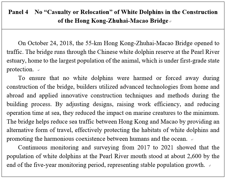 Strengthening the supporting role of science and technology and encouraging standard-setting. China is strengthening research on the evolution and internal mechanisms of marine ecosystems, carrying out projects designed to achieve technological breakthroughs, and developing standards and norms to make eco-environmental restoration more holistic, science-based, and workable.