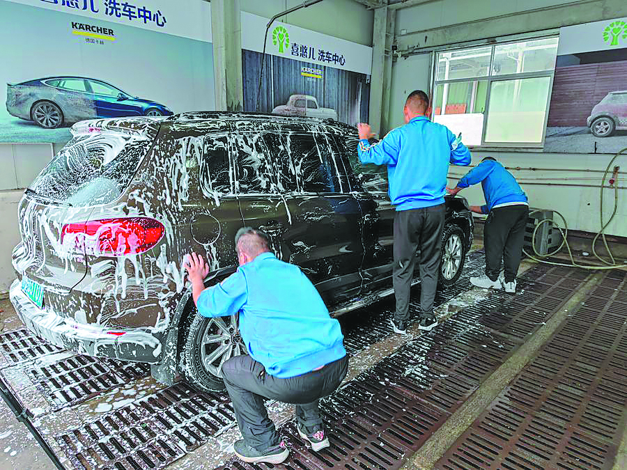 SHENZHEN — At a car wash nestled within the bustling city of Shenzhen, a group of employees start their day at 8 am with a self-devised routine. They spray water, work up a foamy lather and sway to the beat of lively music, treating the task of washing cars as if it were a delightful game.