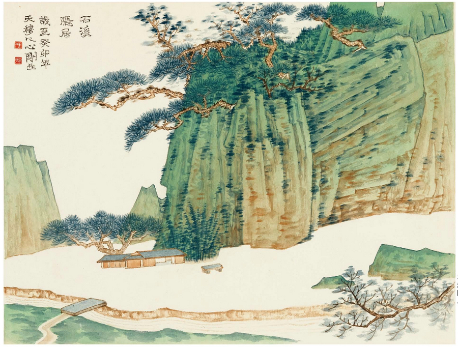 The vivid works are evident of his researches of the monumental landscapes of the Song Dynasty (960-1279), as well as the neat composition and elegant colors pursued by Song's court artists in their flower-and-bird paintings.