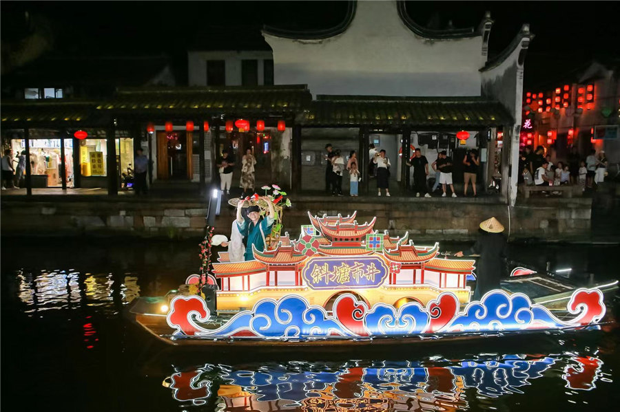 Tourists view the Dream of Xitang: Boat Stories parade in Xitang ancient town, Jiaxing city, Zhejiang province, July 5, 2024. [Photo provided to chinadaily.com.cn]