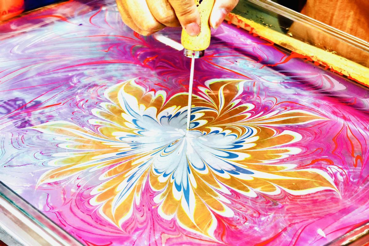 Zhang Shuangmin might look a bit haphazard as she drips pigment onto a square container of water. The pigments immediately disperse into small circles once they touch the surface of the transparent liquid, and without wasting any time, Zhang swirls them with an awl in seemingly casual movements.