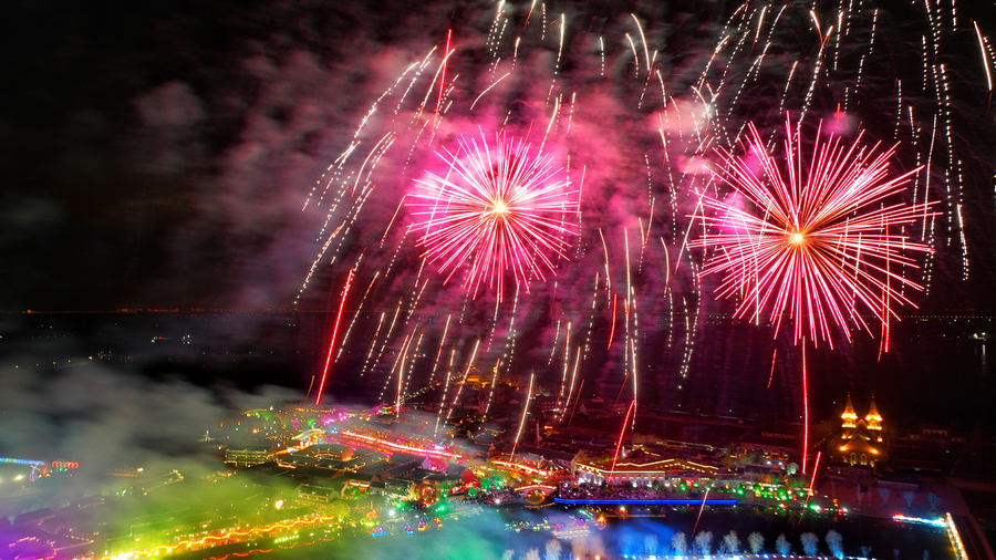 Firework shows are staged in Yaowan Ancient Town in Xinyi, Xuzhou, East China’s Jiangsu province. [Photo provided to chinadaily.com.cn]