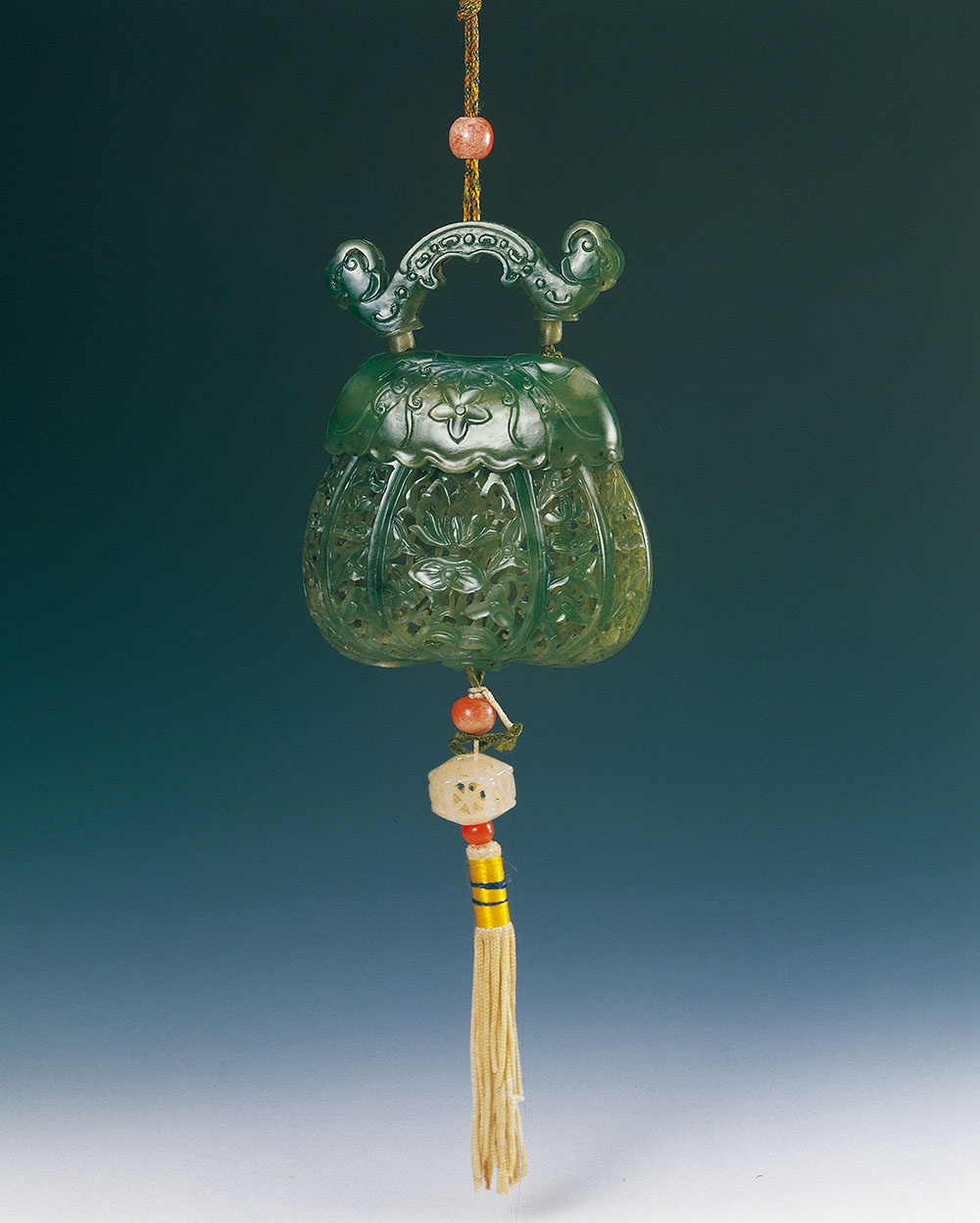 Discover the beauty of a miniature lotus pond in this exquisite Qing Dynasty (1644-1911) jade sachet! Comprising a pouch, a lid and a handle, this sachet features intricate round carving, openwork and relief techniques. Shaped like a budding lotus flower, the pouch is adorned with delicately carved lotus leaves and blossoms, creating a stunning green oasis of peace in miniature form.