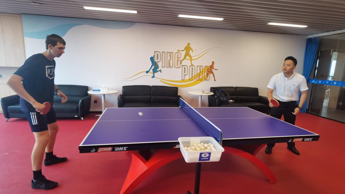 An American university student compares notes on playing table tennis with a staff member in the Shudao Investment Group Co Ltd on July 14, 2024. [Photo by Huang Zhiling/chinadaily.com.cn]