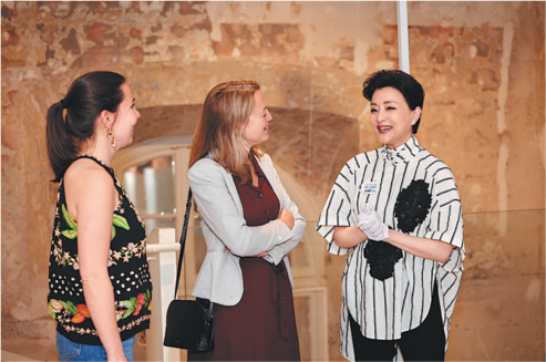 Yang Lan (right), co-curator of Exposition Reviving Craft, exchanges ideas with two visitors. CHINA DAILY
