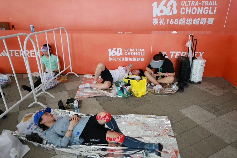 Competitors rest at the finish line after completing the race on July 14, 2024. [Photo by Wei Xiaohao/China Daily]
