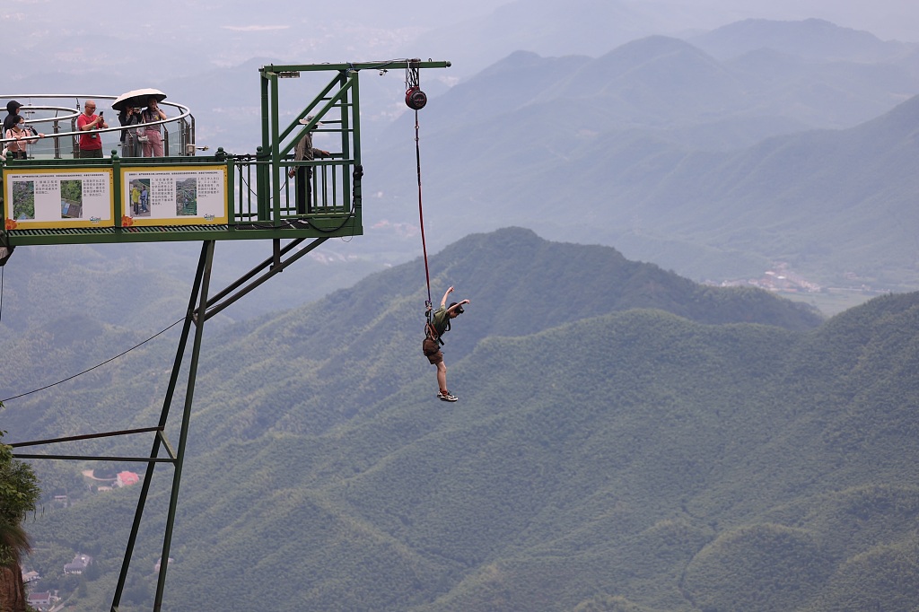 People experience bungee jumping in Anji, Zhejiang province, July 21, 2024. [Photo/VCG]