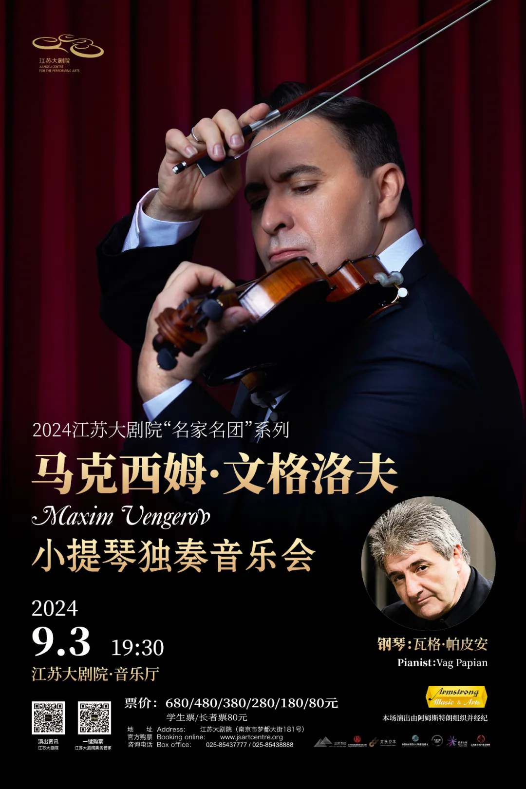 Grammy Award winner Maxim Vengerov, one of the world's finest musicians, is set to perform at Jiangsu Centre for the Performing Arts on Sept 3. Accompanied by pianist Vag Papian, he will take the audience through a journey of romantic and passionate music, revealing exquisite melodies with emotional and technical brilliance. Don’t miss this musical feast!