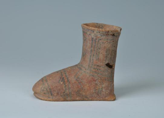 Isn’t this adorable painted pottery boot from over 3,000 years ago reminiscent of a contemporary snow boot? It features a burgundy ceramic coating with symmetrical black double-line motifs on the shaft and black double-line strips and triangle patterns on the upper. Its design offers a glimpse into the footwear of ancient people, indicating that they had already moved beyond primitive footwear made from a single piece of animal hide.
